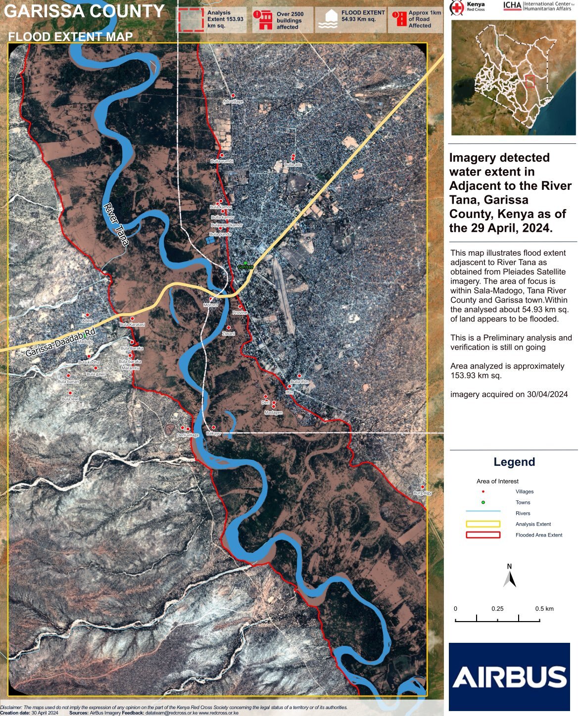 Analysis of satellite imagery showing expansive farmlands under water and livelihoods lost. Thus, an increase in the displaced population between April 15th & April 30th. The total number of households displaced in Garissa has exceeded 16,000. Most affected areas include Mororo, Ziwani, Bula punda, Deri, Madagen, Bakuyu, Iftini and Provine. The recovery period will be longer than the rain season.