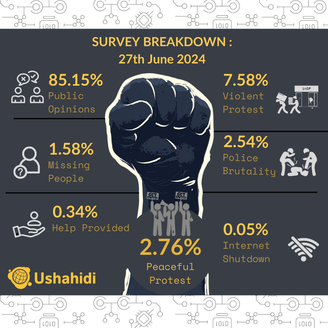 On June 27th, public opinion remained prominent, with 85.15% expressing views on protests and the government. Other submissions included reports of violent protests at 7.58%, peaceful protests at 2.76%, police brutality at 2.54%, missing persons at 1.58%, assistance provided at 0.34%, and internet shutdowns at 0.05%