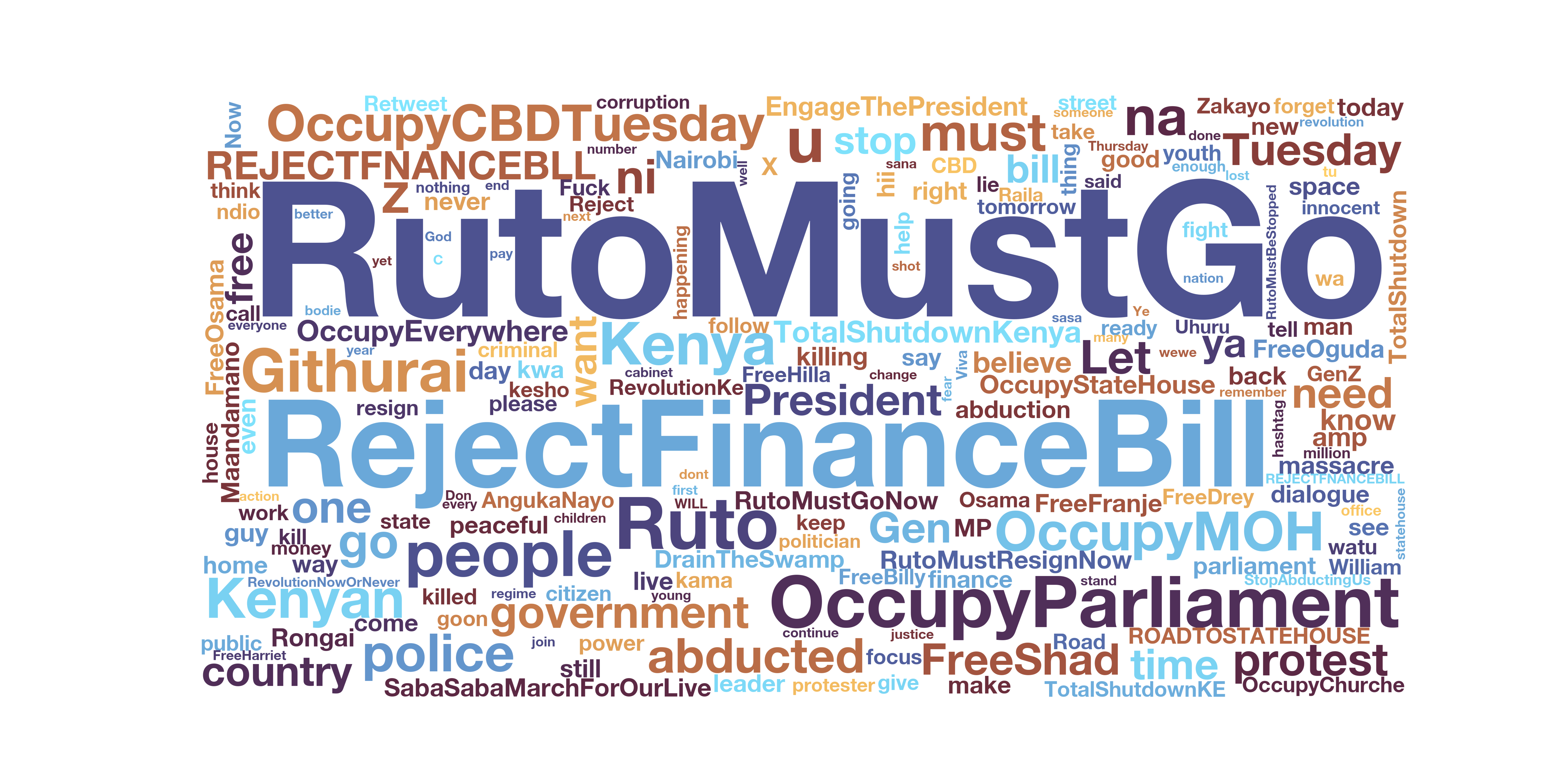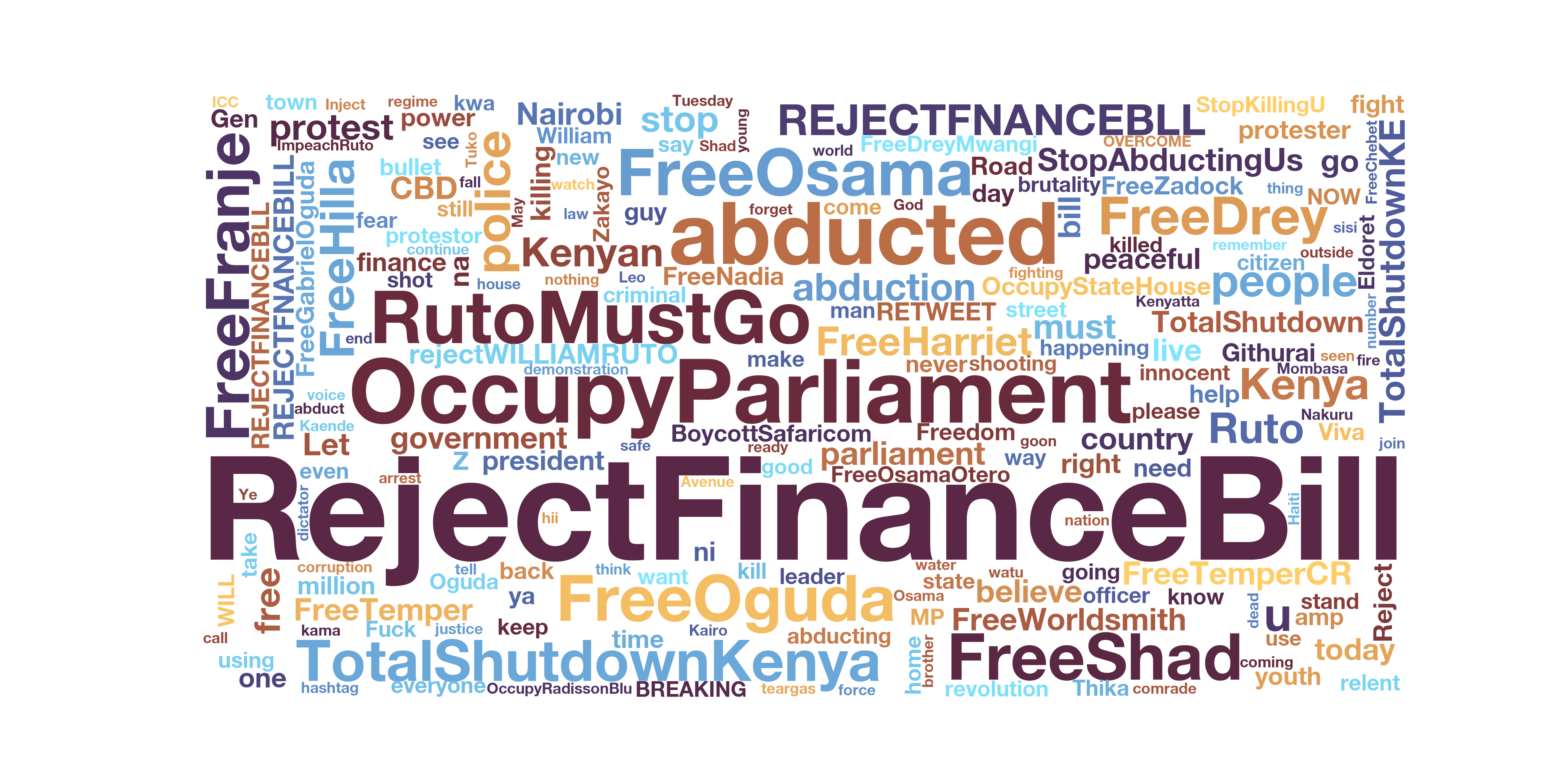 The word cloud highlights themes of economic justice, direct action, and political freedom. It illustrates the protestors' clear and urgent demands: rejecting the Finance Bill, demonstrating through occupation of political spaces, and advocating for the release of detained activists. These themes collectively paint a picture of a mobilized and determined populace pushing back against perceived economic and political injustices.