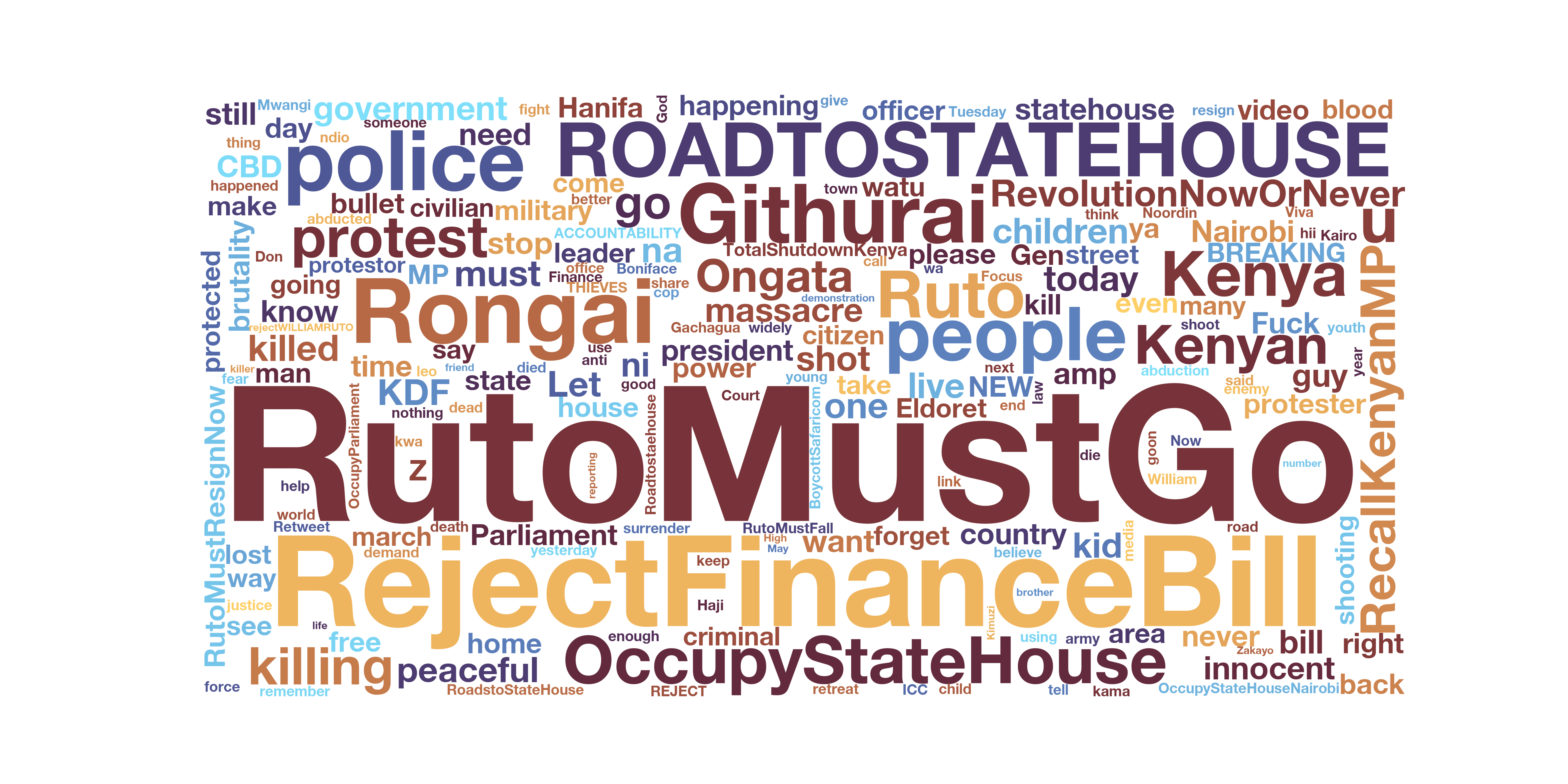 The predominant phrases collectively paint a picture of a populace deeply unhappy with current leadership and economic policies, mobilizing in key areas to demand significant political and economic changes. It is important to note that there is a shift from Reject Finance Bill phrases to Ruto Must Go indicating a citizenry tired of the government of the day and its leader and demanding a resignation. Githurai and Rongai appear to be predominantly due to the heavy protests experienced in the area with deaths reported.