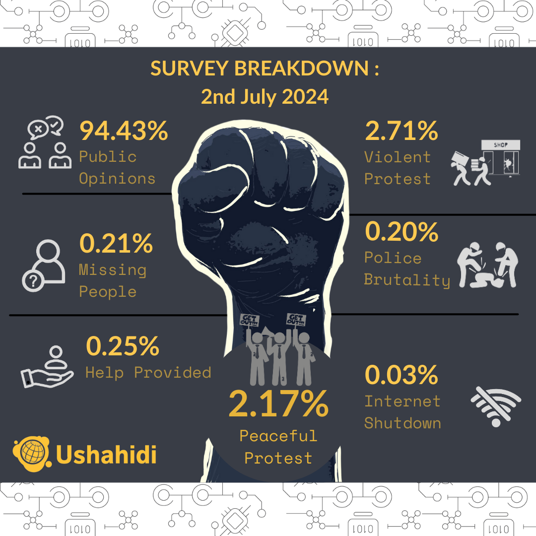 The Ushahidi team set up an instance of our open-source platform, the Reject Finance Bill 2024 Tracker to help with social listening on social media mainly X (formerly Twitter) where citizens shared their displeasure about the finance bill, while also keeping track of missing persons allegedly abducted by security forces, incidences of police brutality, and help being provided by various human rights, legal and medical agencies.