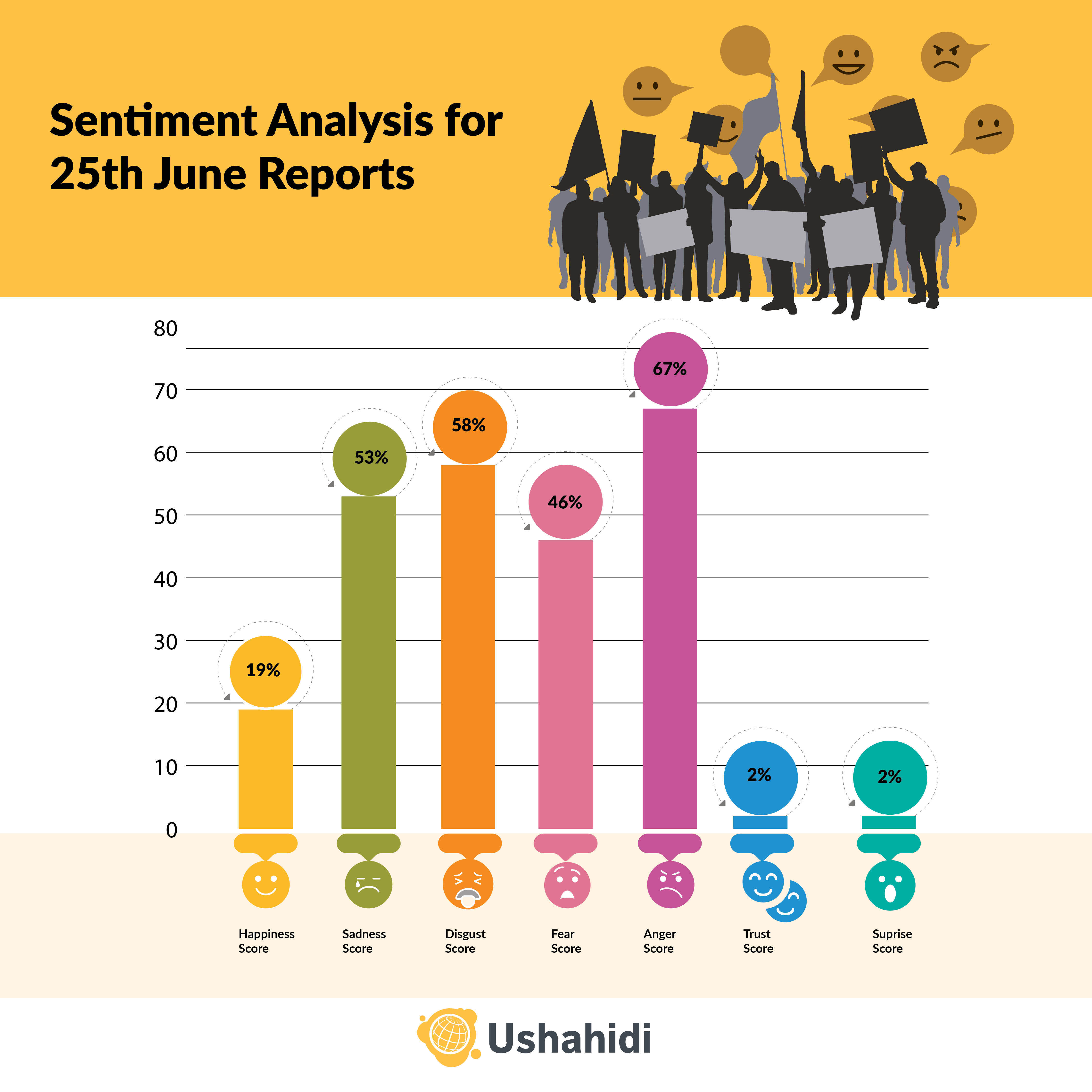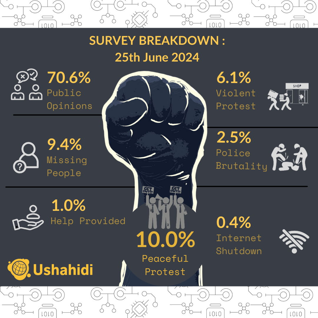 On 25th June, public sentiment was prevalent, with 70.6% expressing opinions on protests and the government. Additionally, other reports analyzed indicated: peaceful protests at 10%, missing persons at 9.4%, violent protests at 6.1%, police brutality at 2.5%, assistance provided at 1.0%, and internet shutdowns at 0.4%.