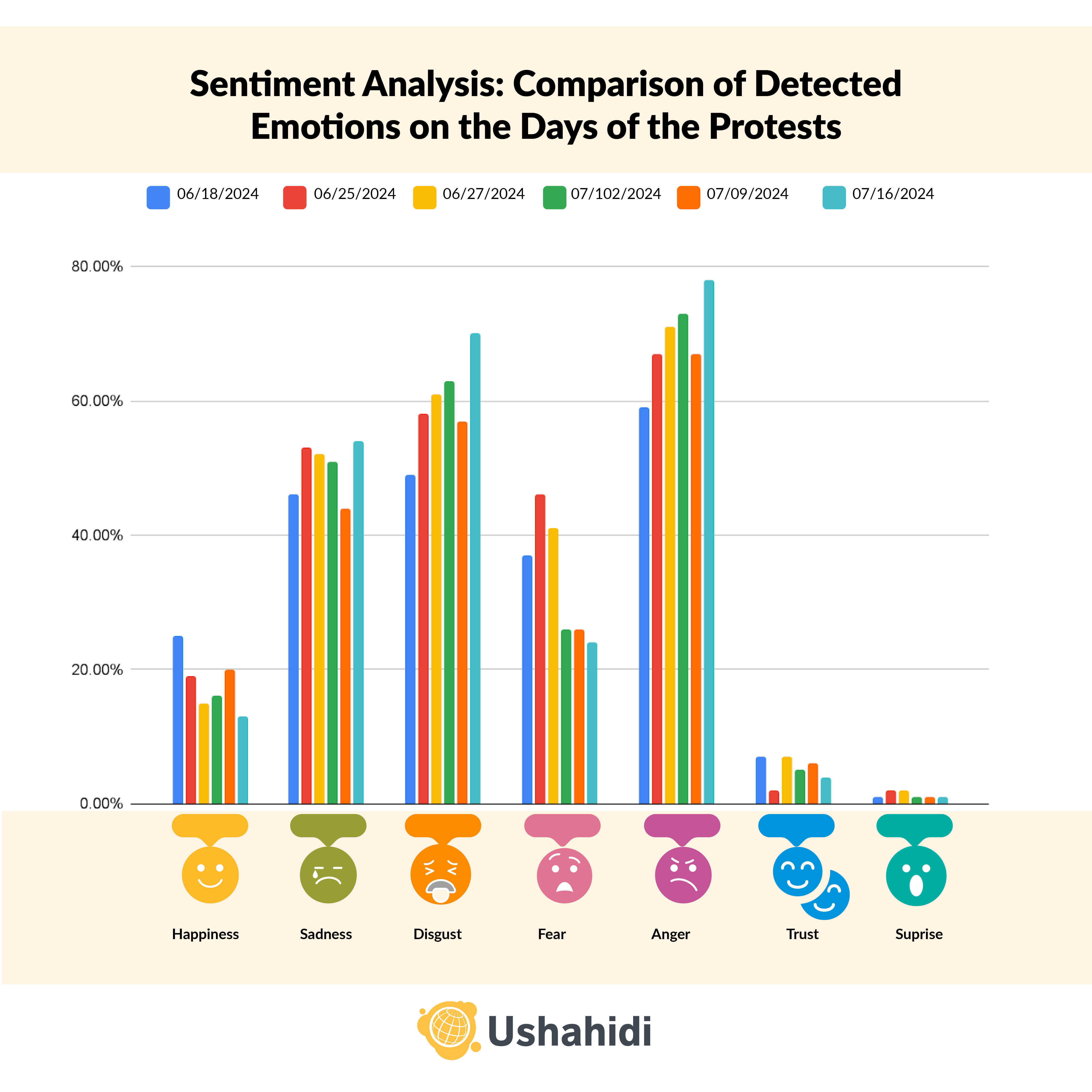 In examining the sentiments of Kenyans during the protests from June 12, 2024, to July 17, 2024, we see clear emotional trends that reflect the public's reaction to the ongoing events. One of the most striking patterns is the relationship between Happiness and Sadness. Happiness initially rose, peaking at 31% on June 14, but then steadily declined to a low of 11% by mid-July. On the other hand, Sadness increased over the same period, reaching 56% on July 12. This suggests that initial hope or optimism gave way to growing sorrow as the protests continued without resolution.