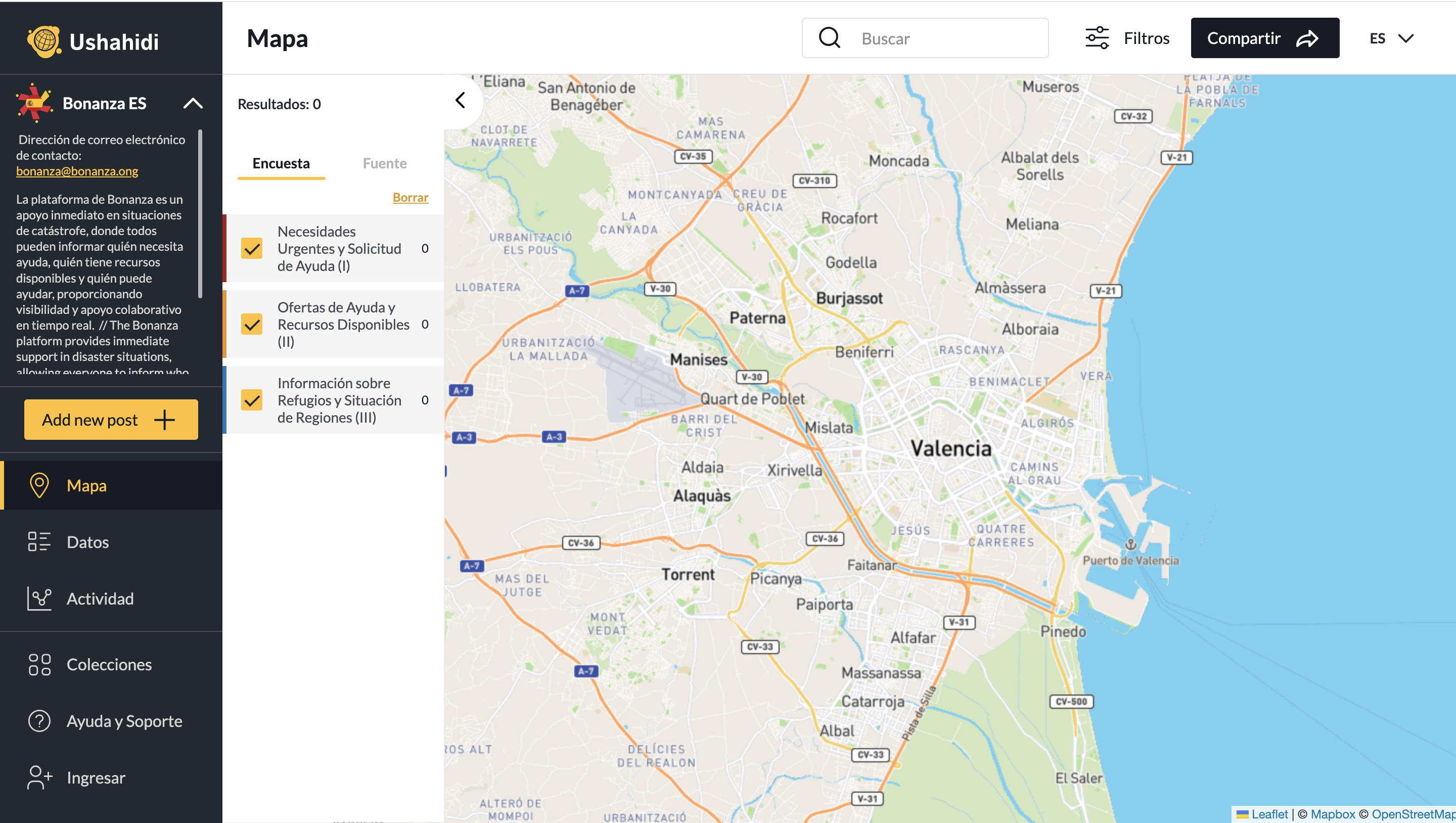 Another deployer created the deployment https://bonanza-es.ushahidi.io/map to coordinate response efforts as well. The deployment was set up in Spanish and collected real-time information on urgent needs and requests for help, help offers and available resources, and Information on shelters and regional situations.